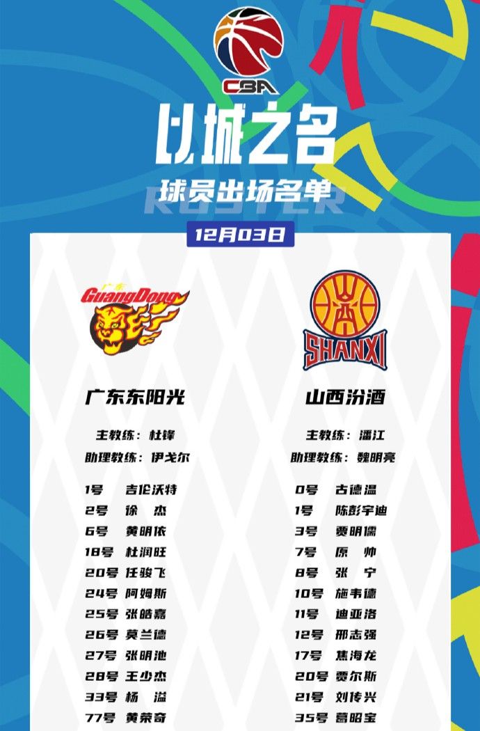 赛前,CBA官方发布了本场比赛双方球员大名单: