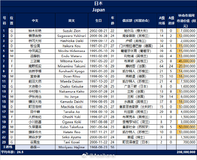 两份名单的身价差距非常大,国足总计895万欧,日本总计2.858亿欧,国足与日本队身价的零头相当。